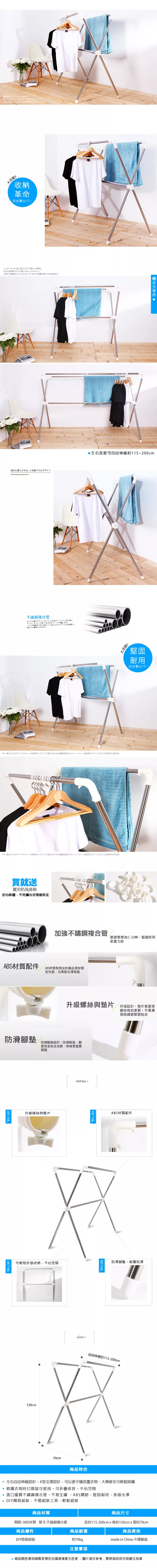 X型折疊不鏽鋼伸縮衣架和曬衣網架兼具使用方便且可摺疊收納,可晾曬棉被、大型衣物和毛線針織冬衣等,適用租屋一族和小家庭。